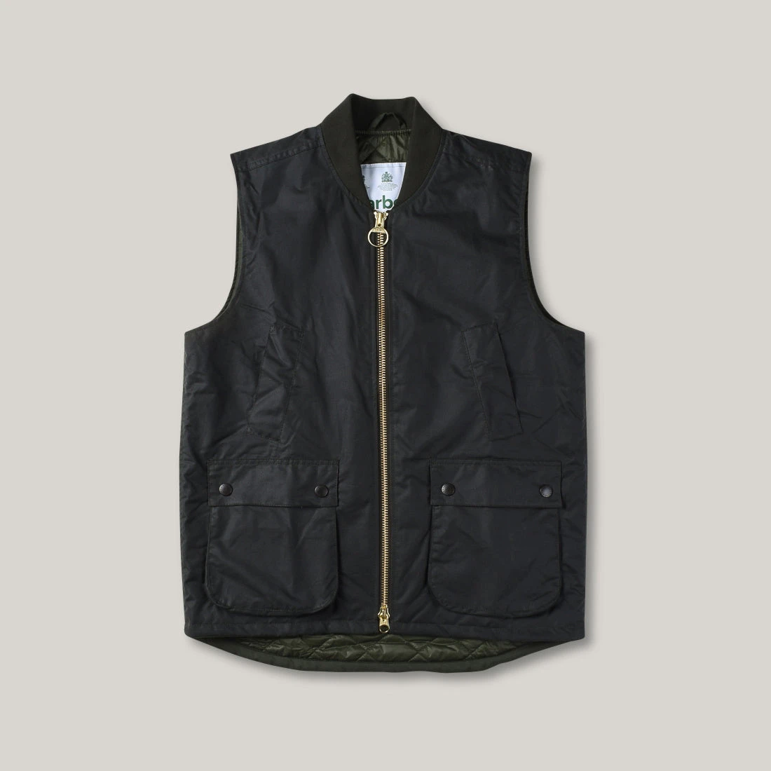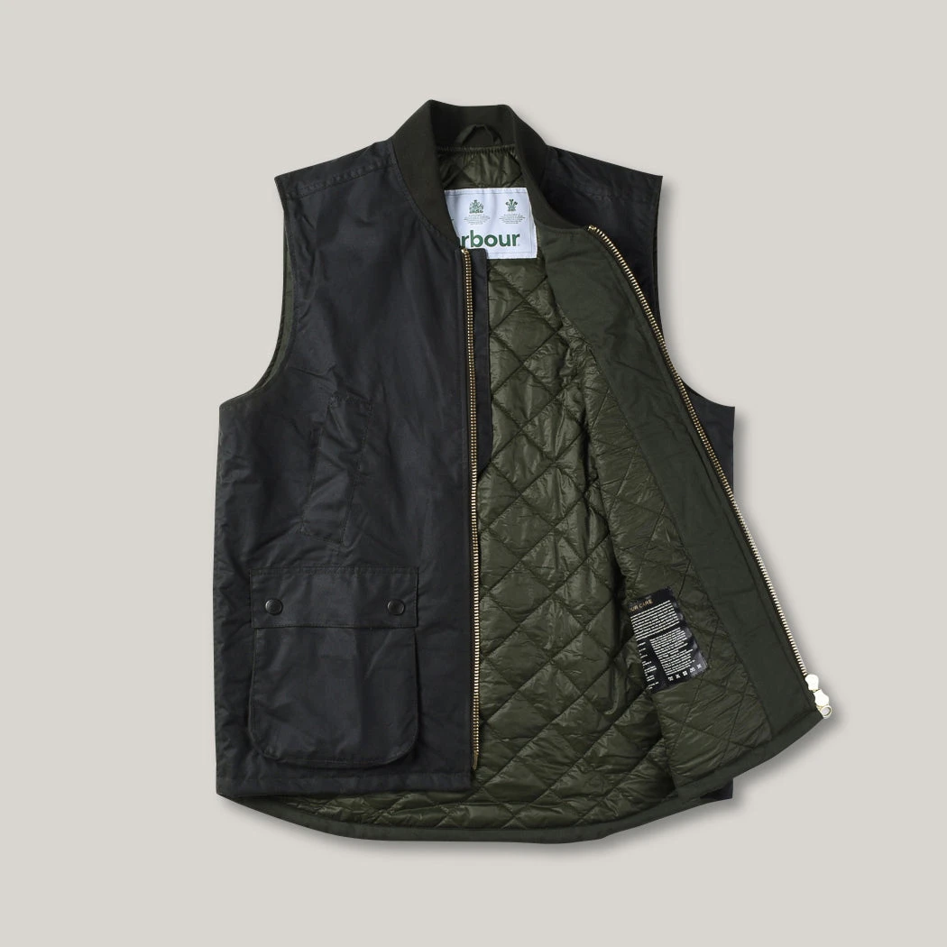 New wax gilet shape from Barbour in their classic waxed cotton, with a rib collar and chunky zip front. Perfect layering piece that is only going to get better with age. Details include two hand warmer pockets, two lower bellows pockets and quilted lining for added warmth. Sizing comes up big so size down on what you normally would wear.