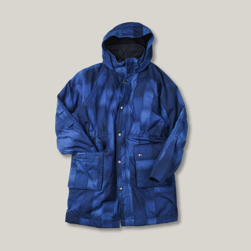 Using pure indigo this outerwear piece has been splashed in the most haphazard yet artistic way, giving an appearance of murky moonlight. Using Primaloft to keep you warm in colder climes, the coat is padded but lightweight. In addition to the padded hood, there are huge hand warmer pockets and a drawstring inlaid to give shape through the body. Winter banger.