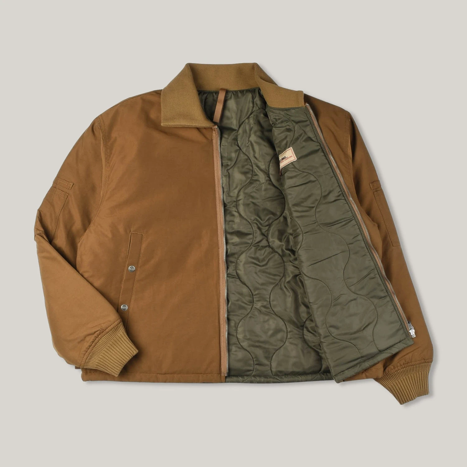 Tanker’ jackets were used by the US Military in WW2 and were originally designed to combat winter weather conditions across all Army divisions, but were more commonly issued to armoured troops – hence the nickname. Quilt-lined, it has a thick ribbed collar and cuffs, with Lybro engraved snap buttons, pen pockets on the arms and herringbone tape side adjusters. The cotton/ nylon fabric also offers water-resistance.