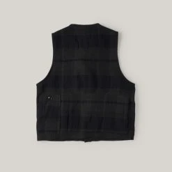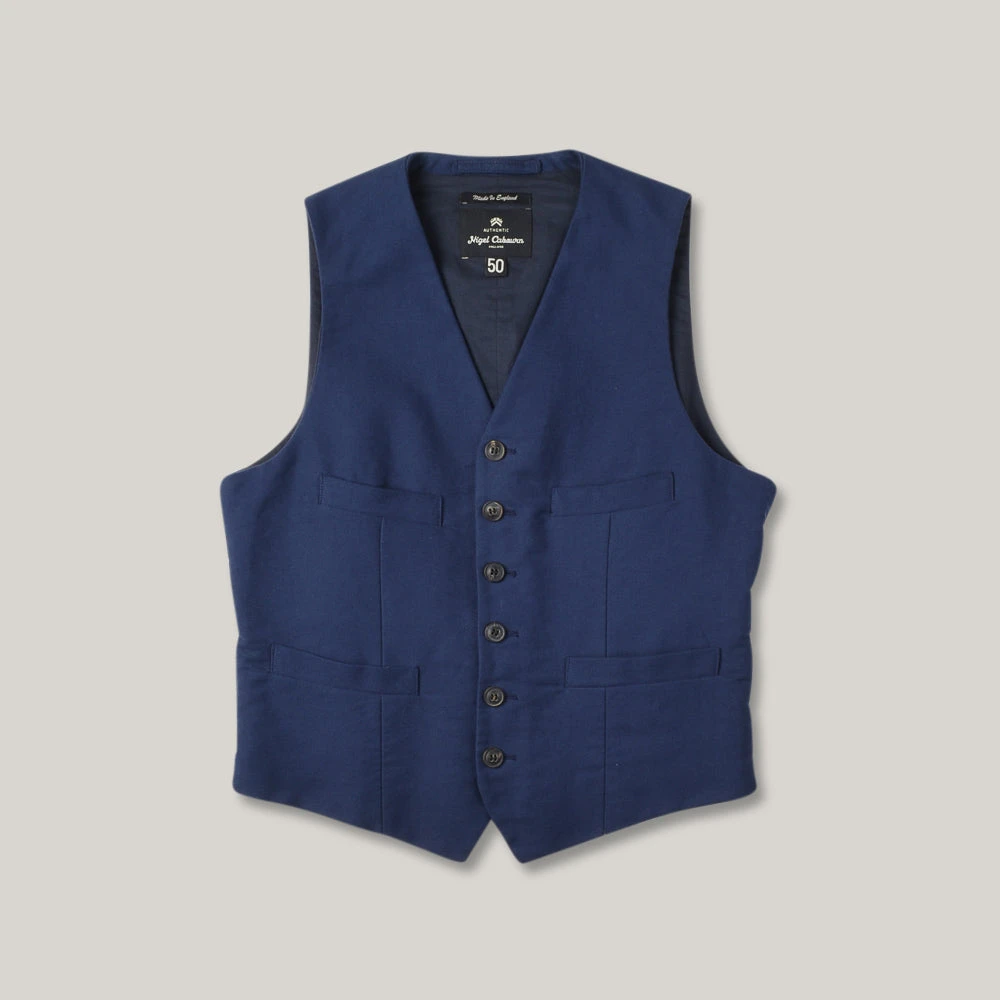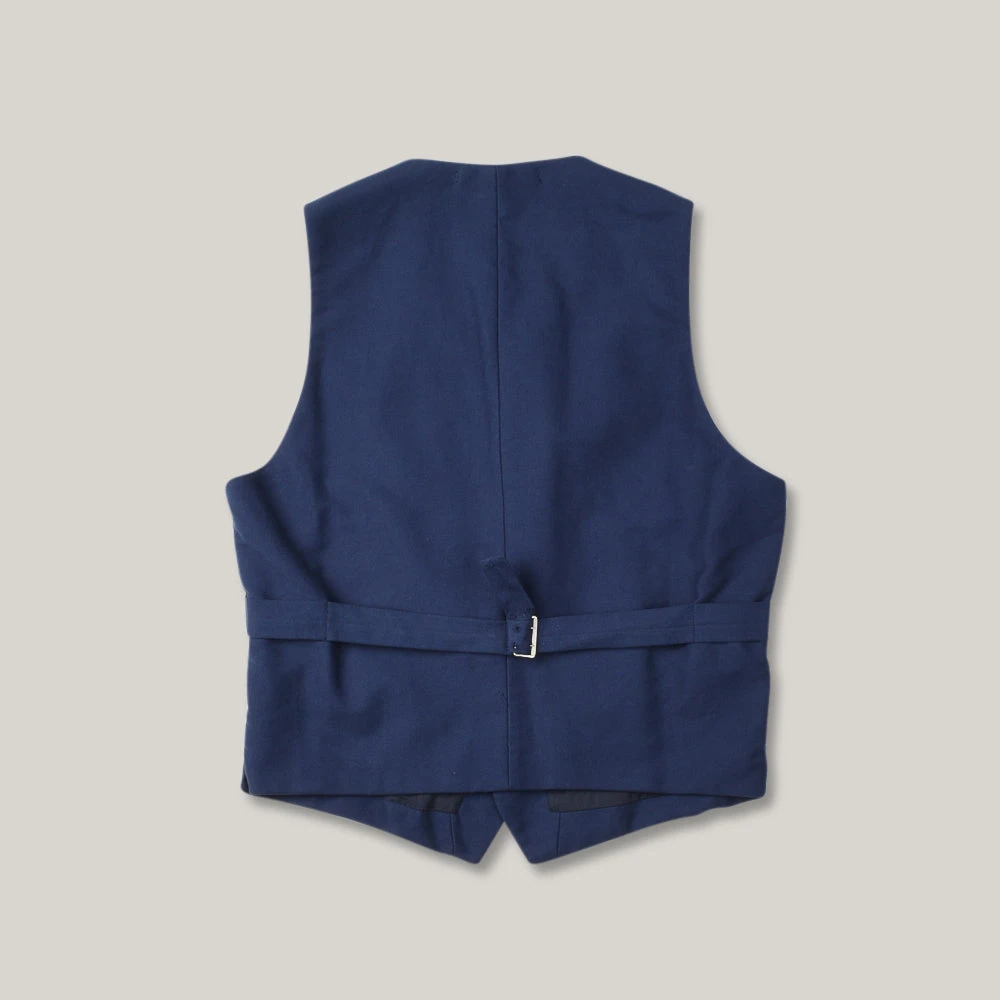 From Nige’s Authentic collection which is all made in the U.K. is this blue thick cotton vest. Originally it was part of an optional three piece suit with matching pants and jacket. The fit is neat but can be tapered further at the back with the double pronged buckle. Further details include leather backed buttons and four pockets on front for all your trinkets.