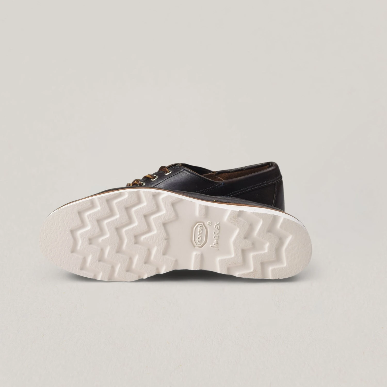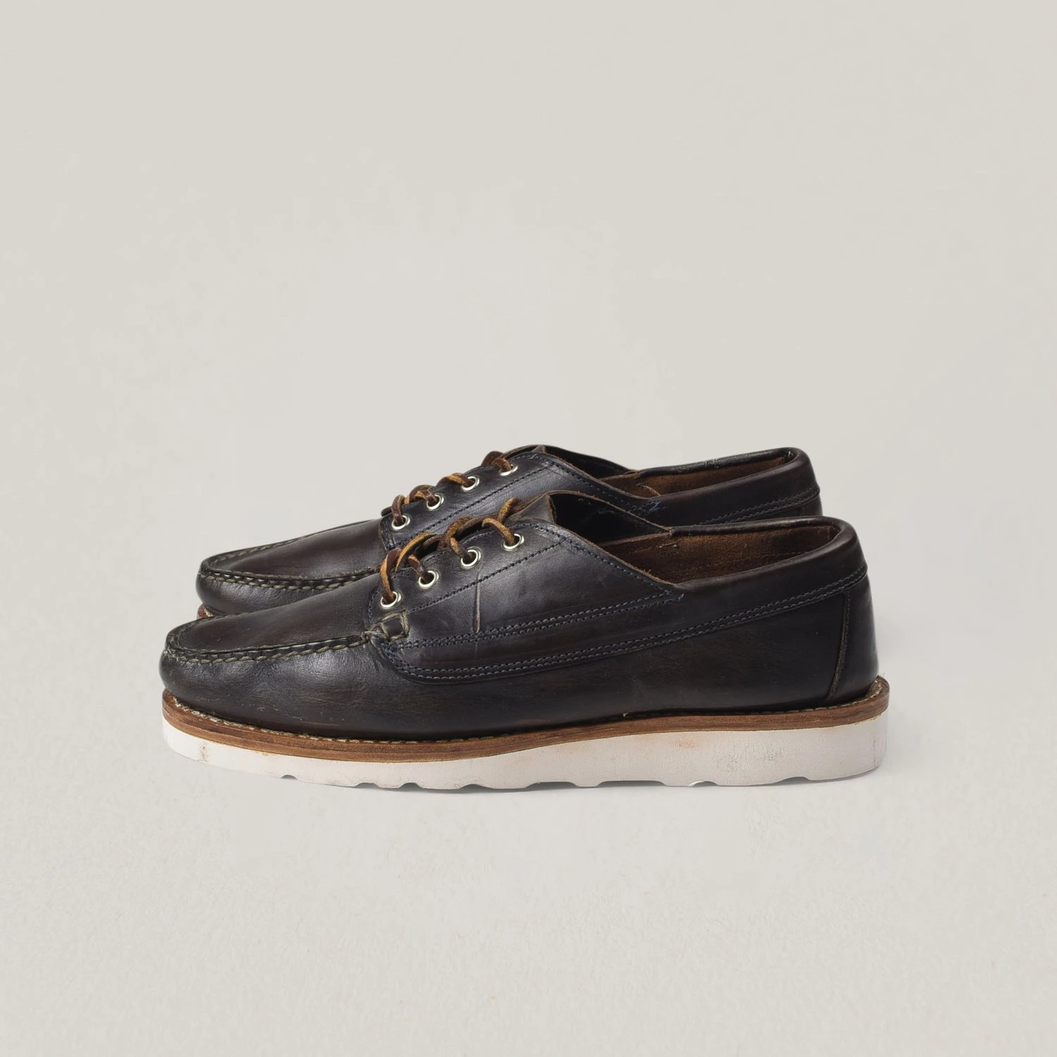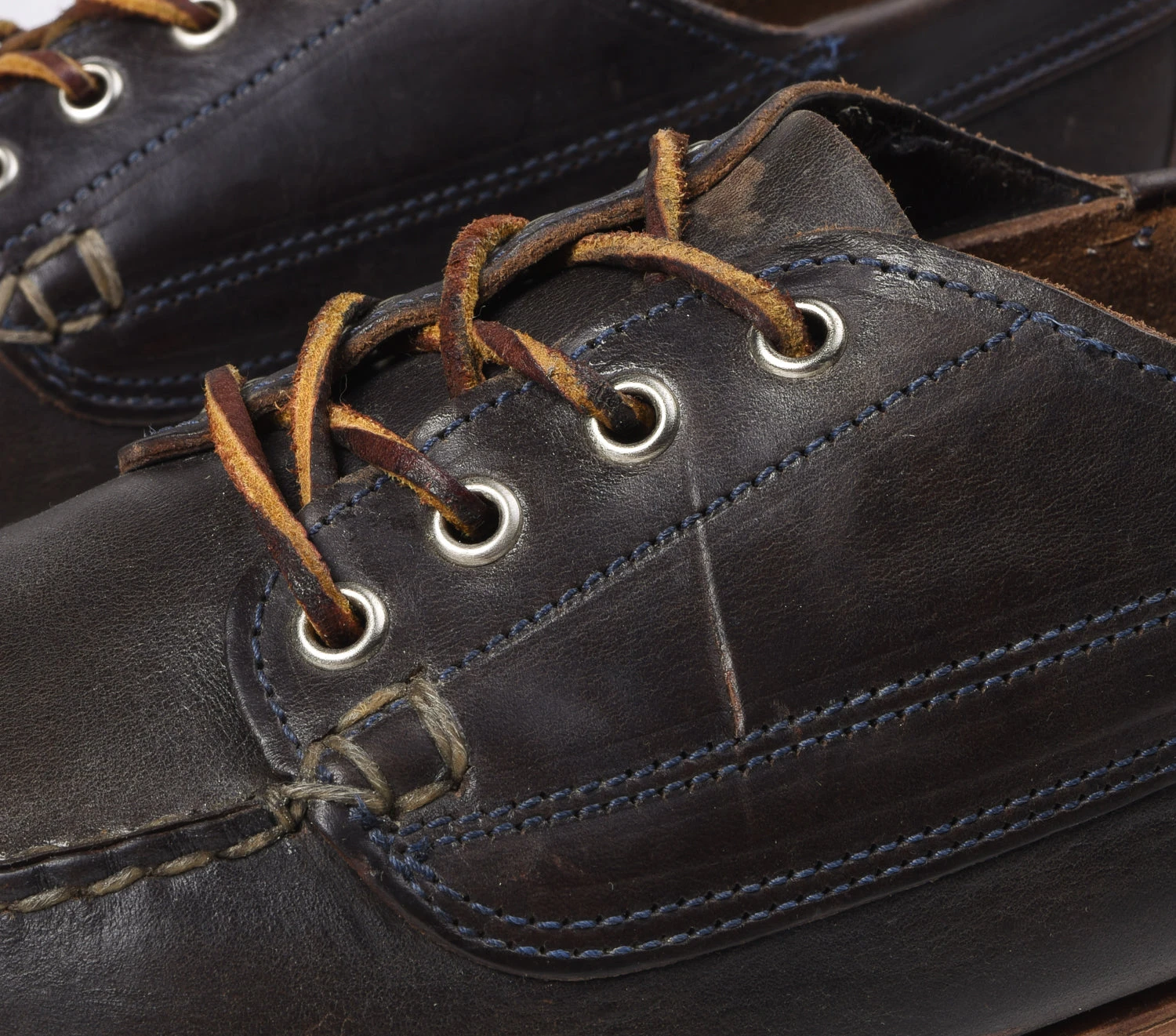 These shoes are a lovely hybrid between a New England moccasin and smart deck shoe, with a genine handsewn construction of Horween Chromexcel leather, waxed thread and rawhide laces. Recently resoled with a brand new Vibram Morflex sole. True to size.
