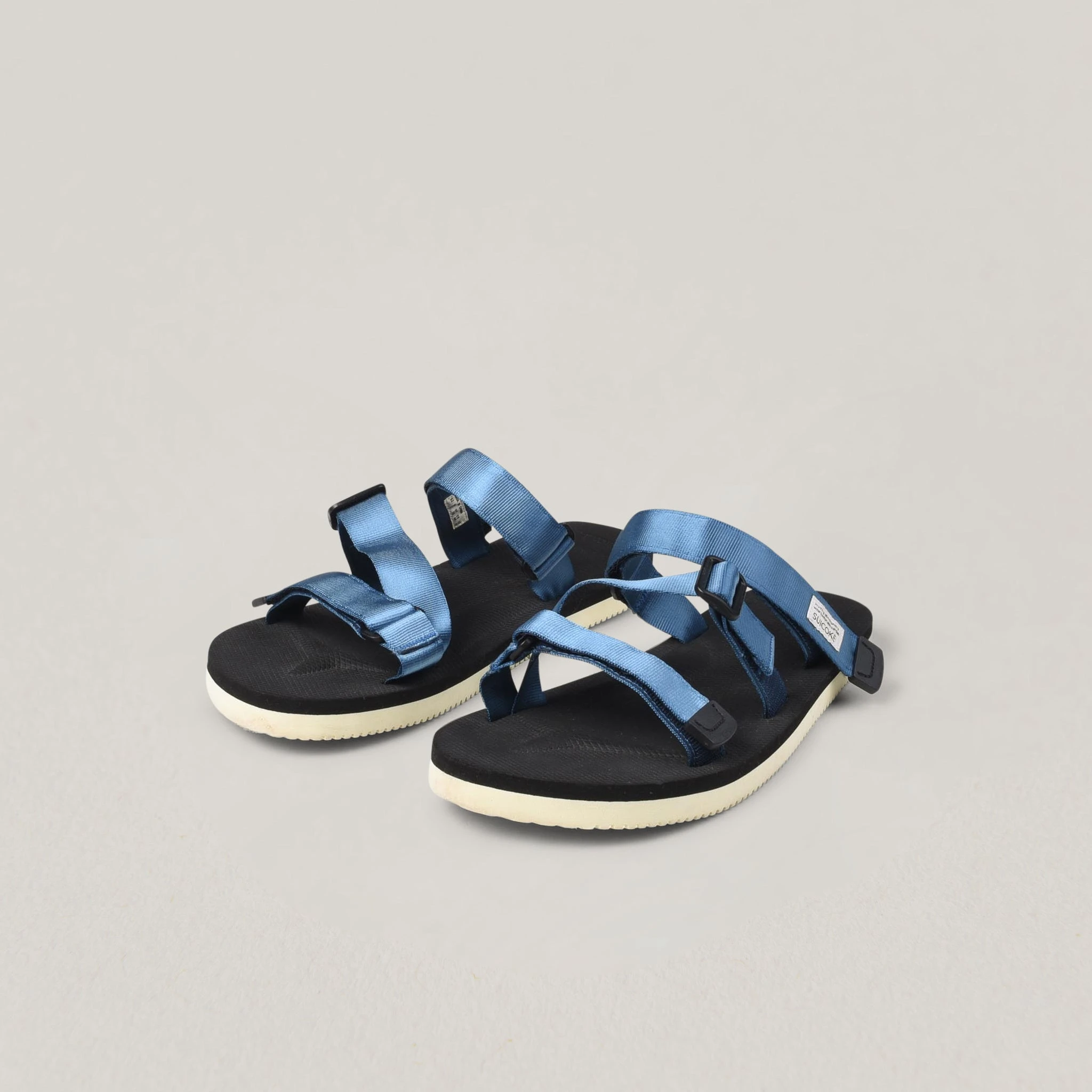 Triple strap sandals from Japanese sandals titans Suicoke. These simple sandals have a black and white sole with sky blue straps to secure.