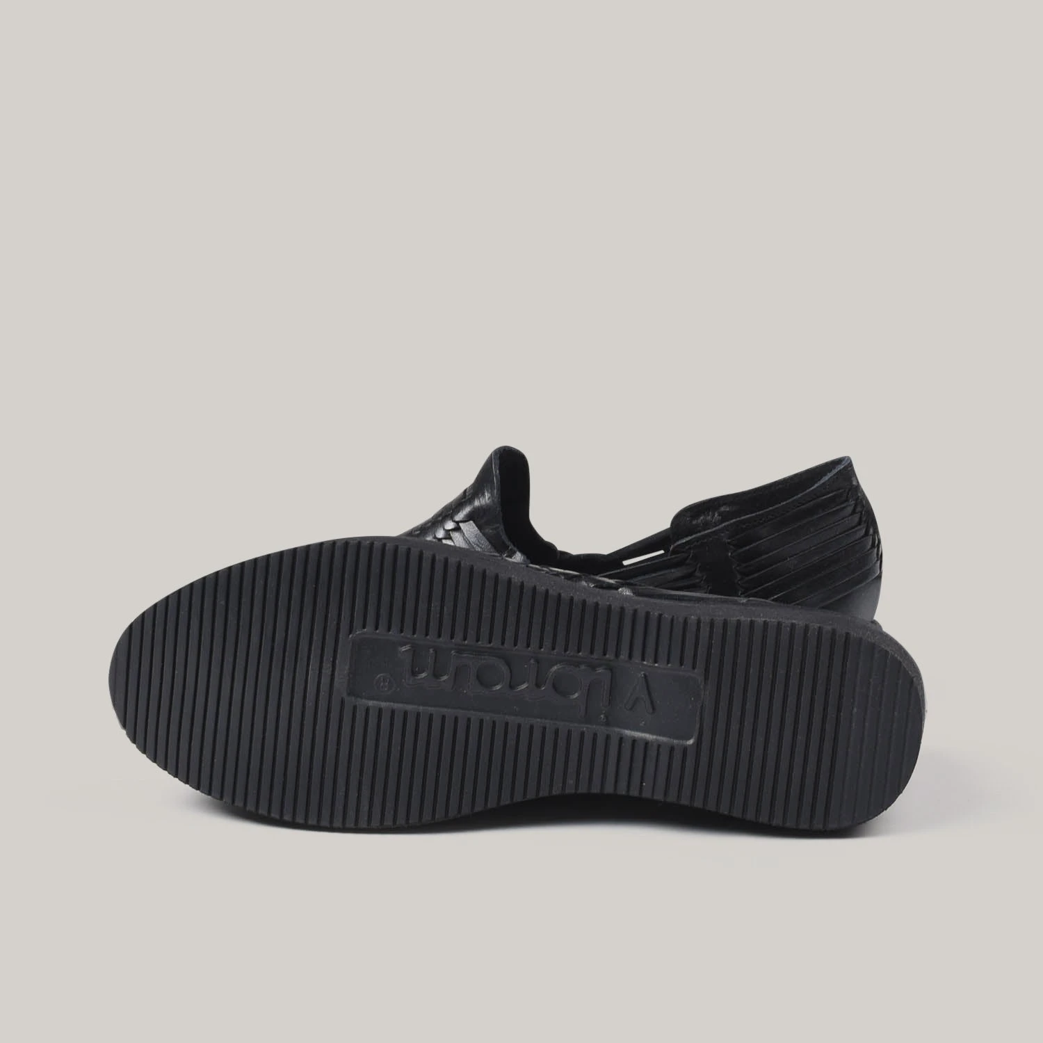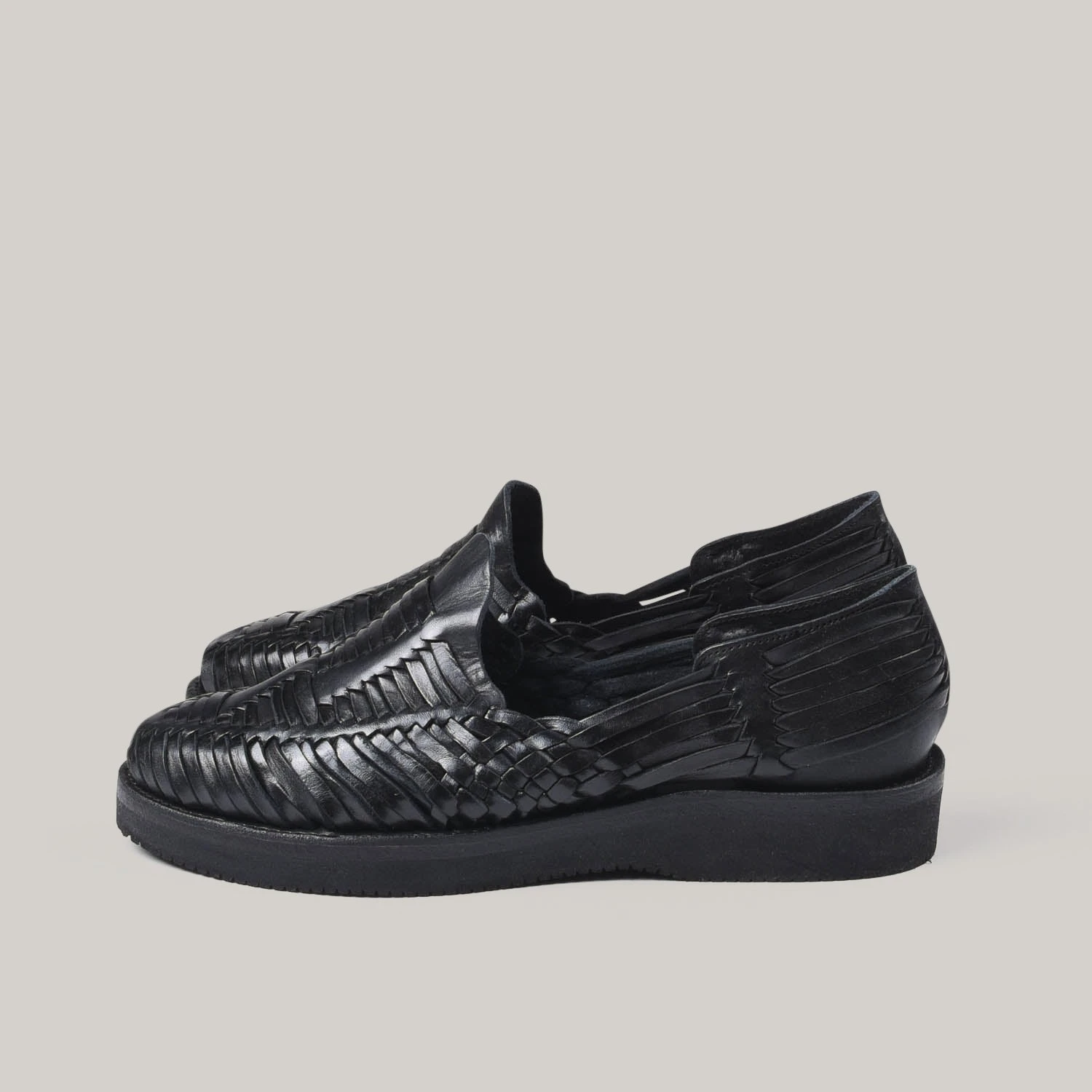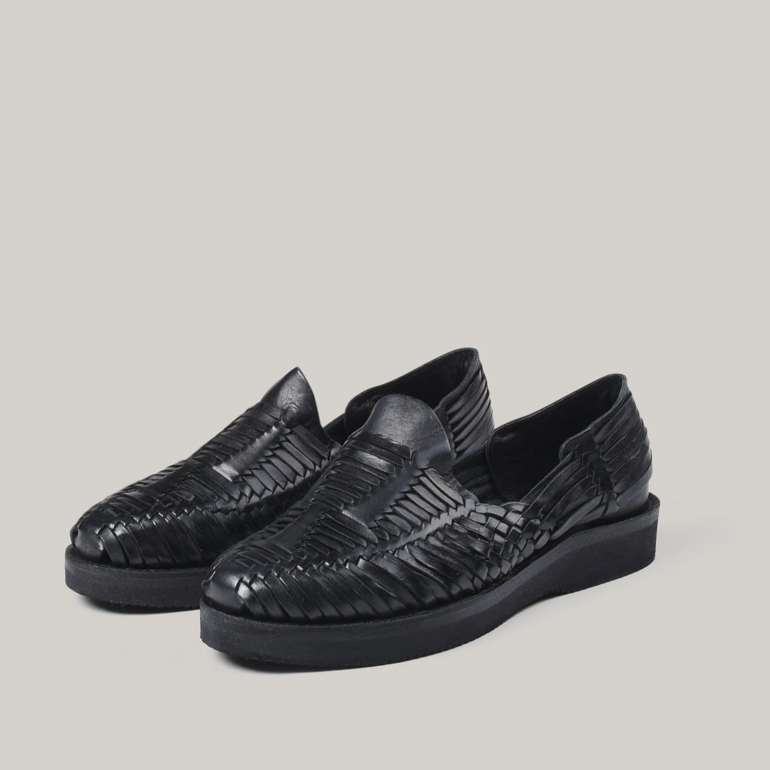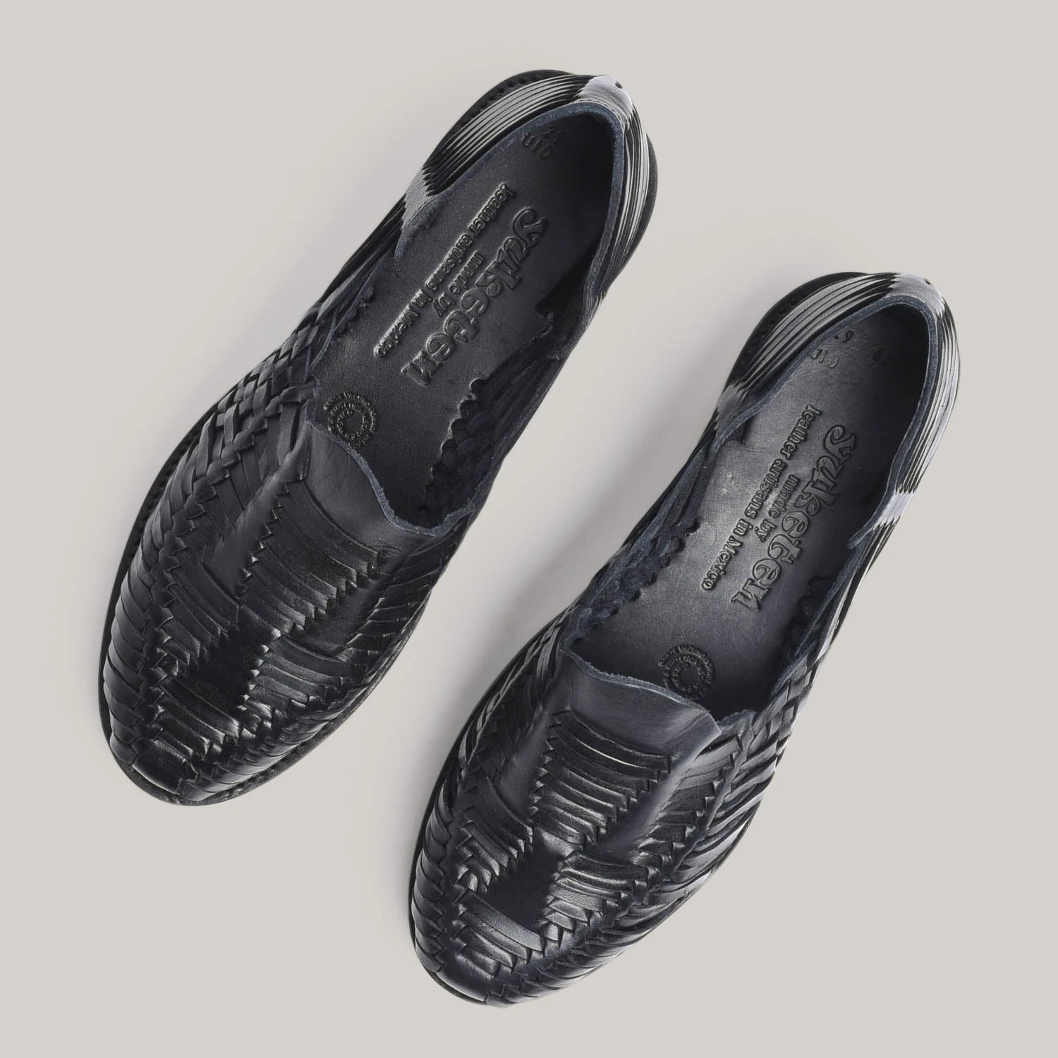 Yuketenโs Alejandro design is a classic slip-on design inspired by a primitive Mexican huarache style. Each pair of Yuketen huaraches is handcrafted in Mexico by highly skilled indigenous artisans using traditional huarache construction techniques. Each of the upper leathers are hand-dyed, and entirely hand-cut and hand-woven using Yuketenโs original vegetable-tanned leather, which will give it a lovely patina in time, less so with this dark black though.